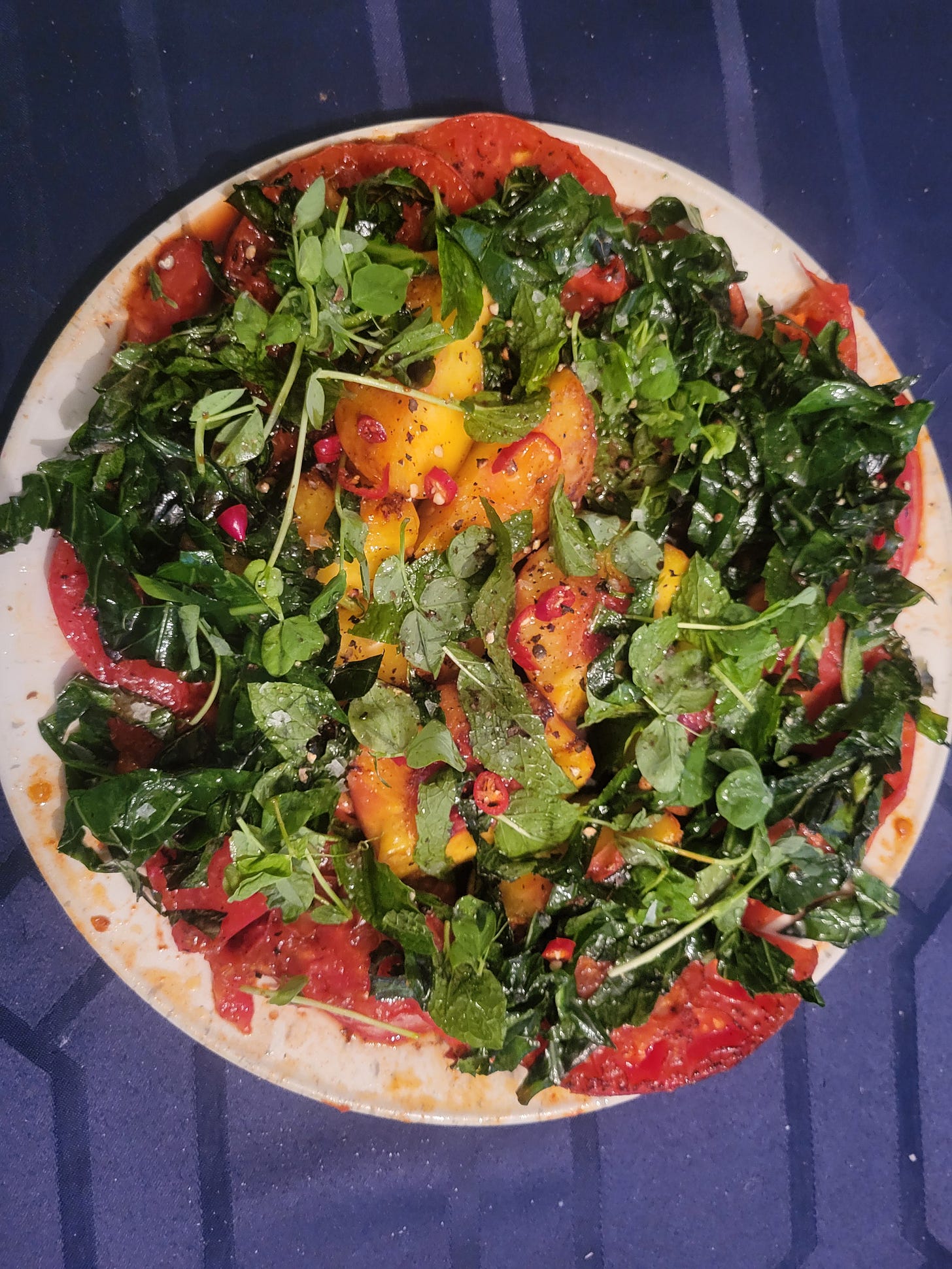 (The basil here is underneath the pea shoots and the quickly-friend chiffonaded collard greens, but trust me, there’s a lot of it.)