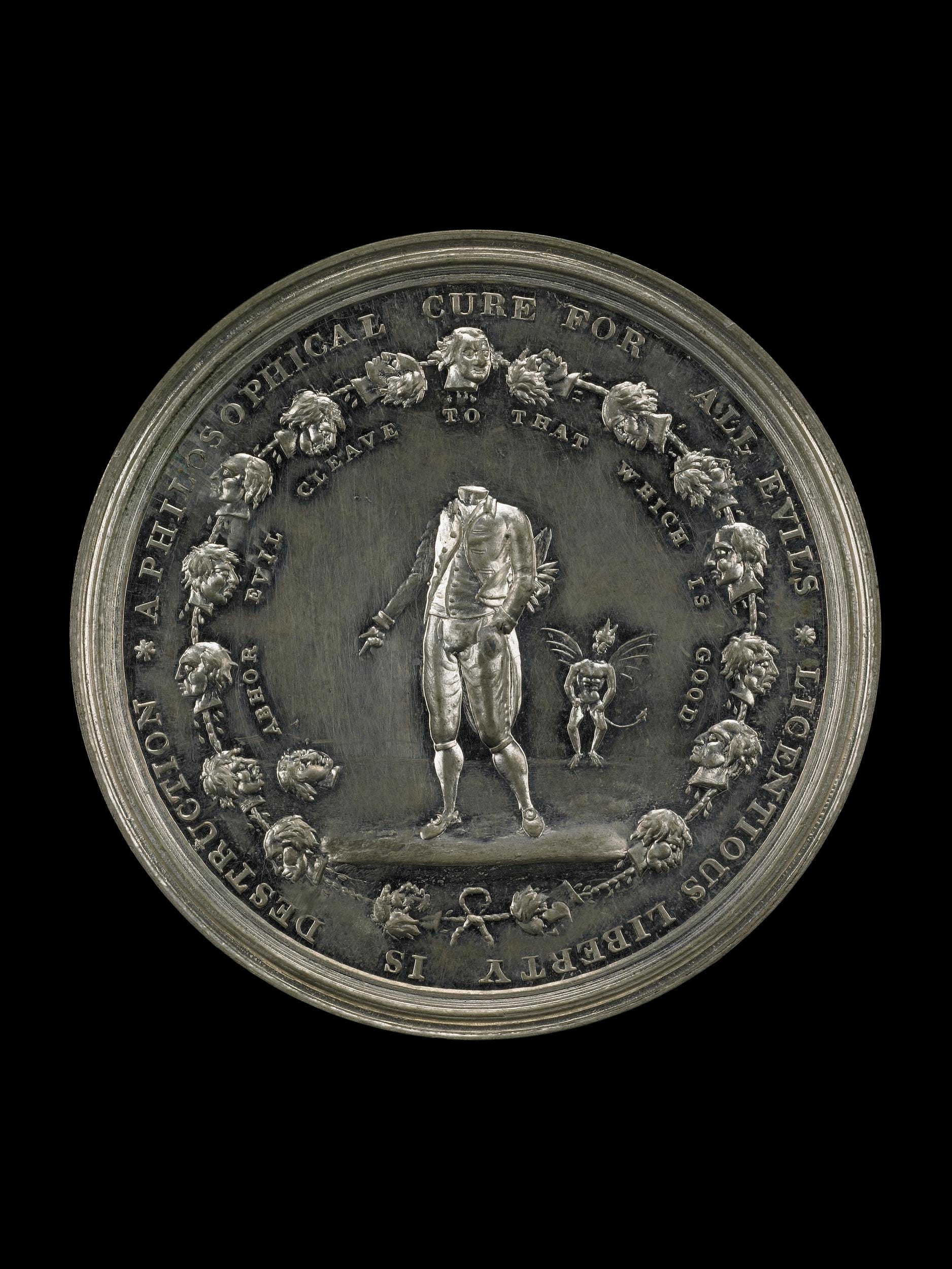 Image credit: W. Whitley, 1795, “Tin medal with a string of severed heads surrounds a standing corpse whose head is falling to the ground. The devil can be seen in the distance. There are two inscriptions one inside the string of severed heads and one outside,” British Museum, https://www.britishmuseum.org/collection/object/C_SSB-243-11
