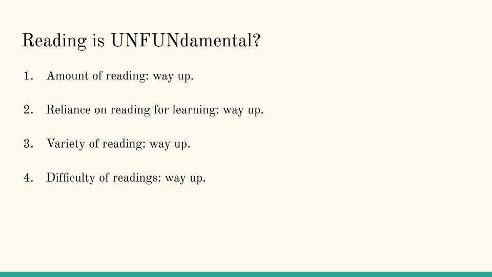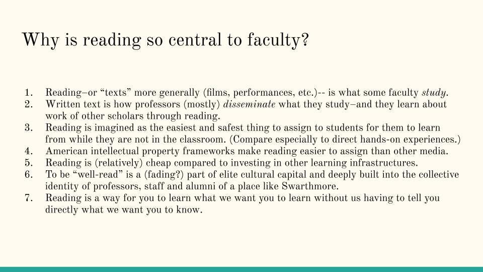 Over the years, a fair number of people have found their way to my little essay about reading in college, which periodically gets messed up by WordPress updates. That early blogging artifact pushed me to develop a course on the history of reading, which I haven’t taught for a while. It also led eventually to me doing an annual presentation on reading, often two of them—one to our student peer advisors during their training, and one to incoming first-year students.